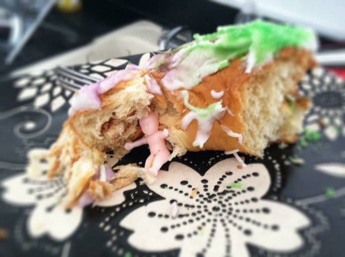 King Cakes are also traditionally served with a surprise baked inside: a small, plastic figurine of a baby.  It’s supposed to symbolize baby Jesus (remember, Mardi Gras is a religious holiday) and the person who finds it is expected to buy the next King Cake. While I couldn’t actually find any accounts of people choking on the tiny figure, considered yourself warned. Although death by cake wouldn’t be a super awful way to go…